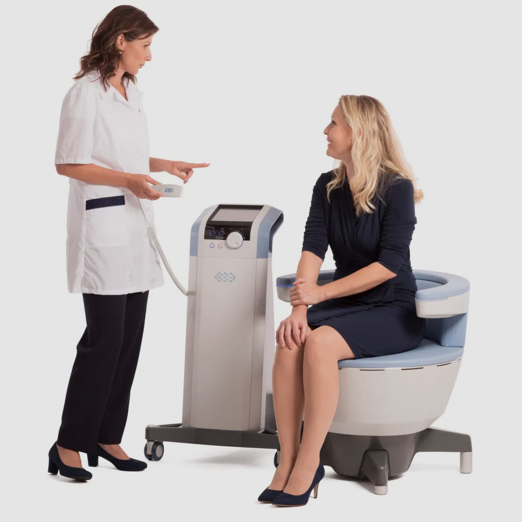 You remain fully clothed while EMSELLA activates deep pelvic-floor and core musculature. Sessions last approximately 28 minutes.